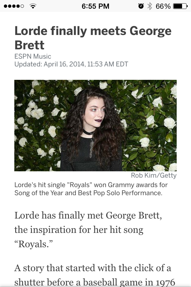 Here’s where it gets really weird. Apparently Lorde was inspired to write her smash hit song “Royals” because she saw a picture of George Brett in his Kansas City Royals uniform signing autographs to kids. So she wrote her song about fame and success and culled the idea of Royals from Brett’s jersey.